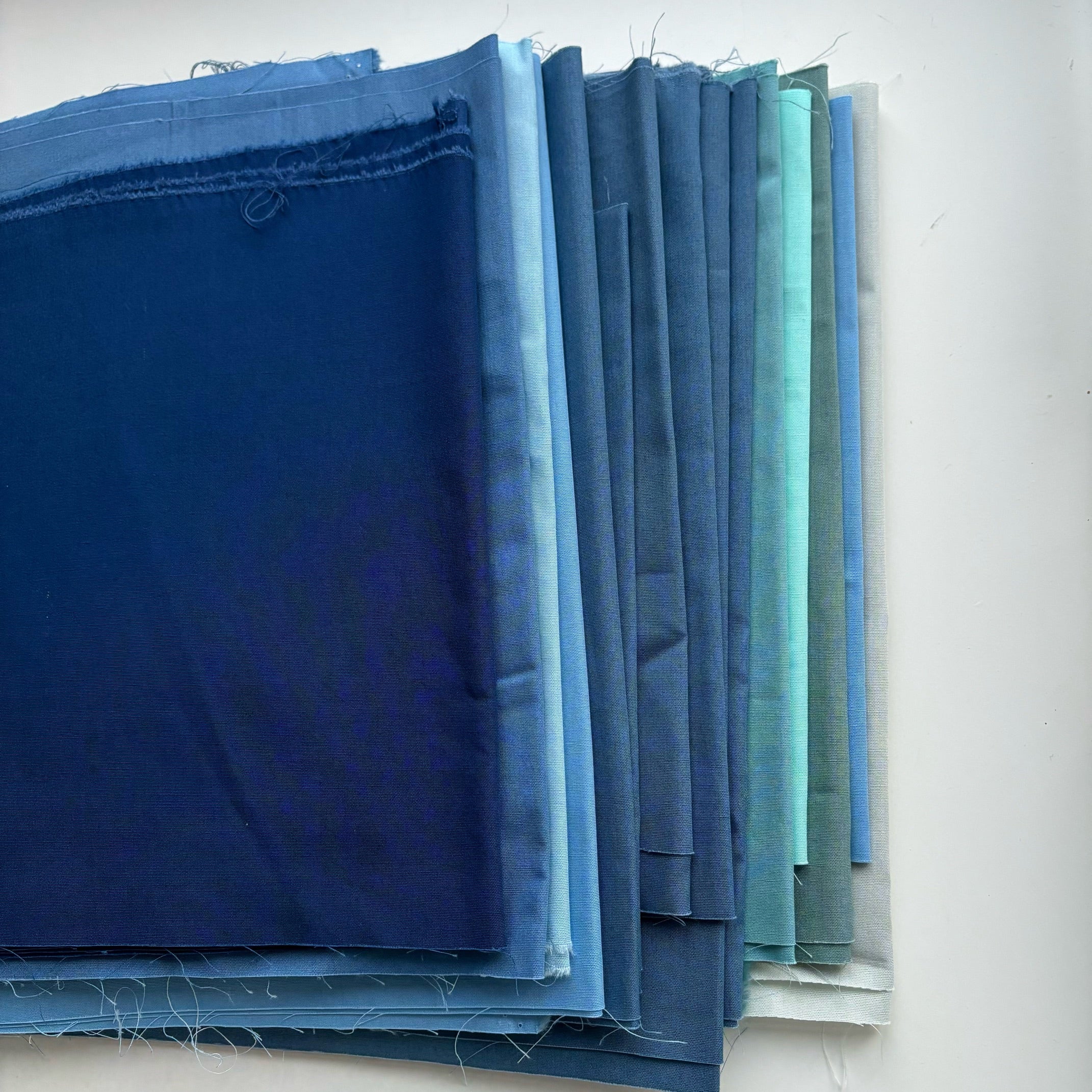 Bundle of scrappy pieces of AGF PURE Solids measuring between 1/8 yard and 1/4 yard. Approximately 3 yards by weight.