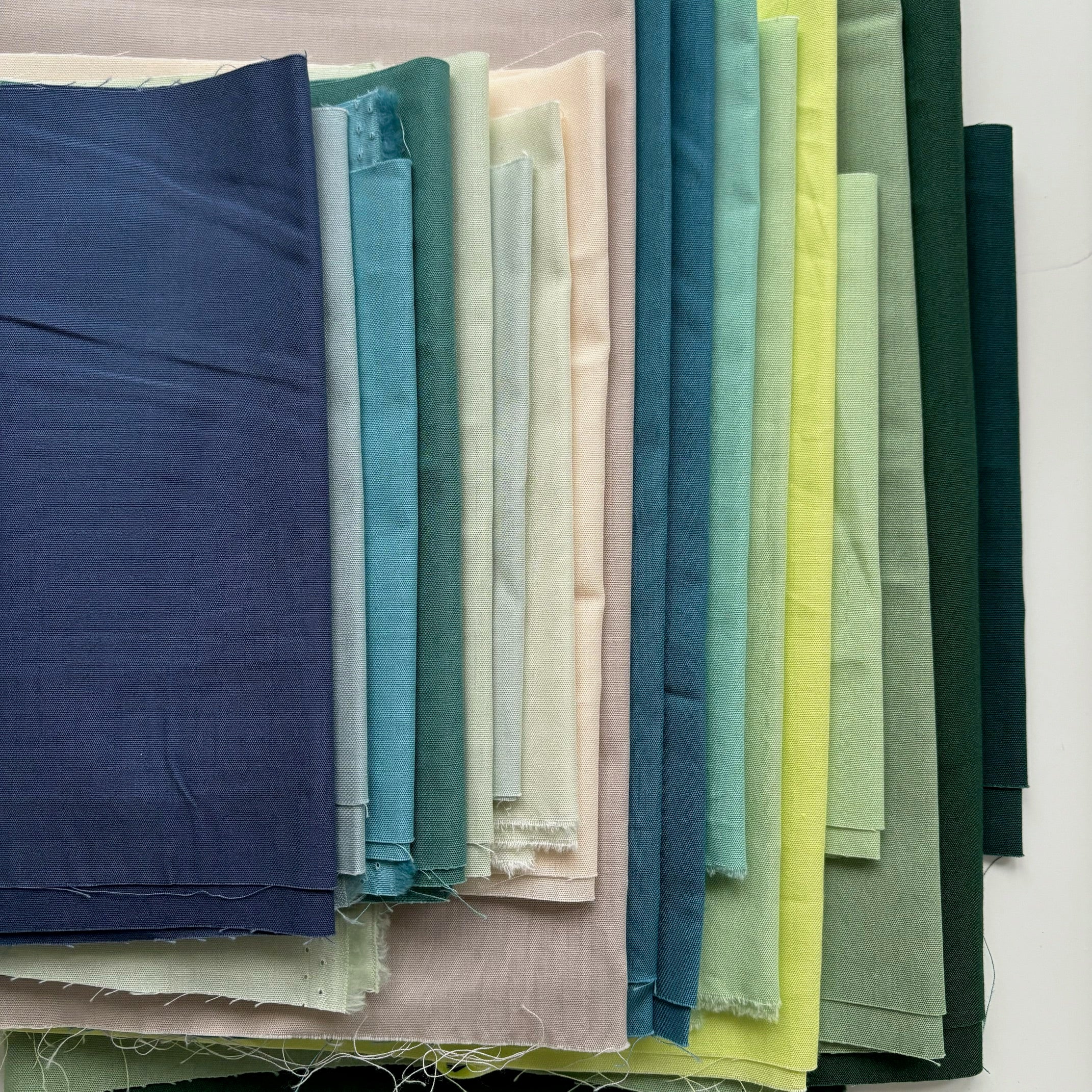 Bundle of scrappy pieces of AGF PURE Solids measuring between 1/8 yard and 1/4 yard. Approximately 3 yards by weight.